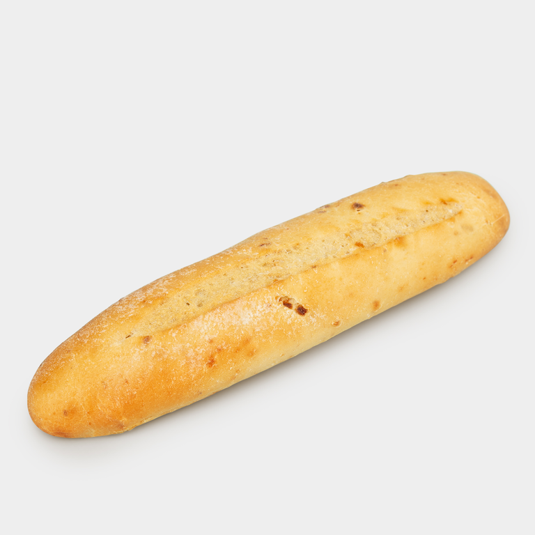 У багета мягкий мякиш, хрустящая корочка, яркий вкус и приятный пшенично-луковый аромат.