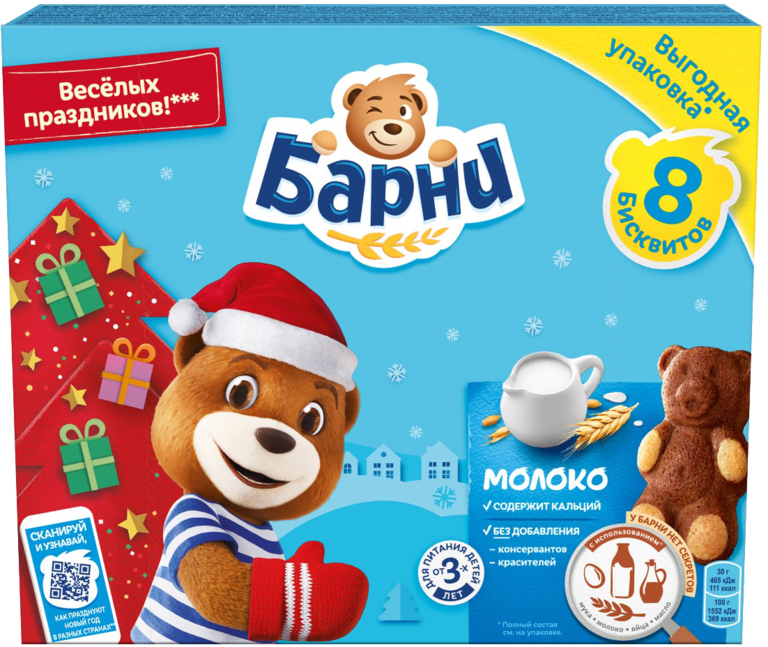 В яркой коробке с новогодним дизайном – 8 пирожных в индивидуальной упаковке. Бисквитного медвежонка удобно взять на прогулку с ребенком или положить в школьный рюкзак для перекуса между занятиями.