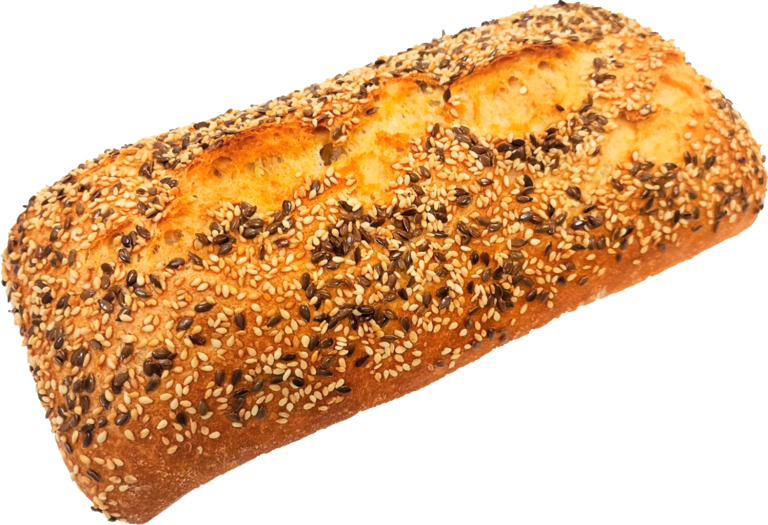 Хлеб из пшеничной муки с хрустящей корочкой, посыпанной семенами льна и кунжута, и пористым, очень воздушным мякишем.