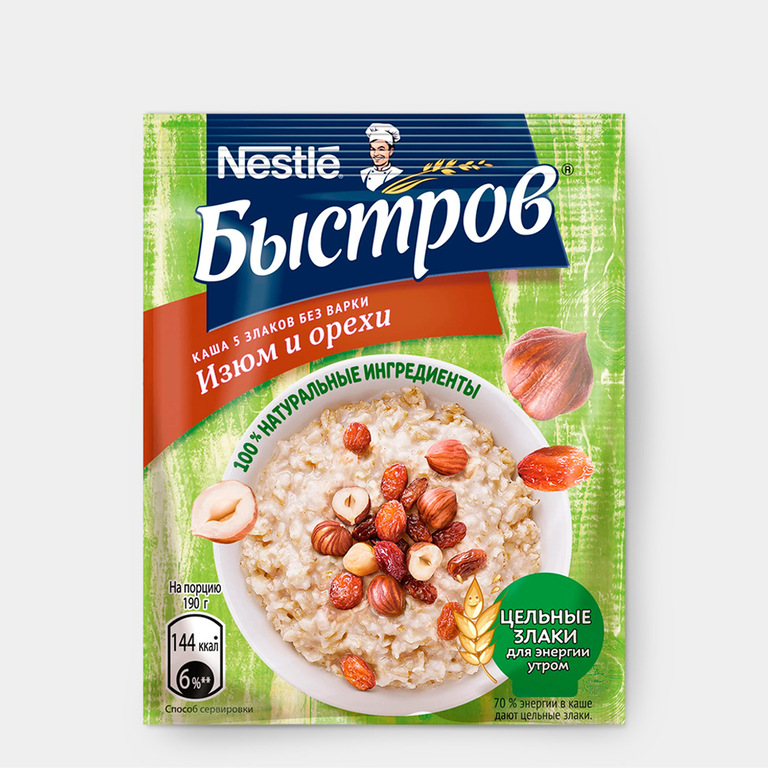 Смесь овсяных, ржаных, ячменных, пшеничных и гречневых хлопьев, не требующих варки, с золотистым изюмом и фундуком.