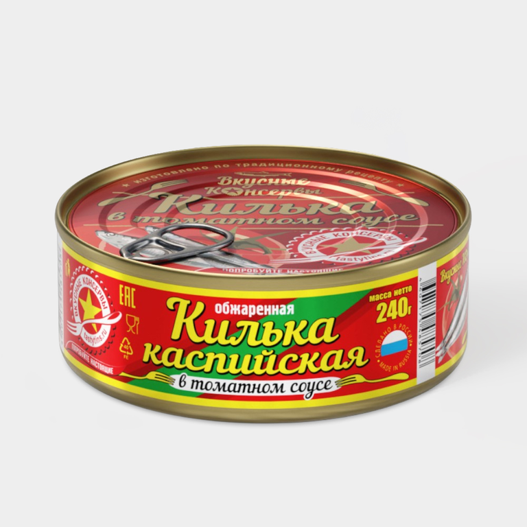 Неразделанная обжаренная каспийская килька в томатном соусе.