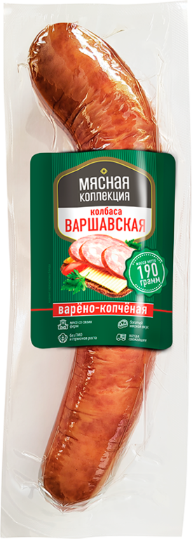 Колбаса «Варшавская» – это мясной продукт высокого качества, с нежным вкусом и соблазнительным ароматом копчения и специй.