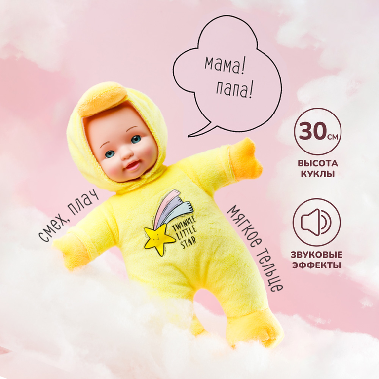 Куколка смеётся и плачет, говорит «мама и папа». Высота игрушки 30 см.