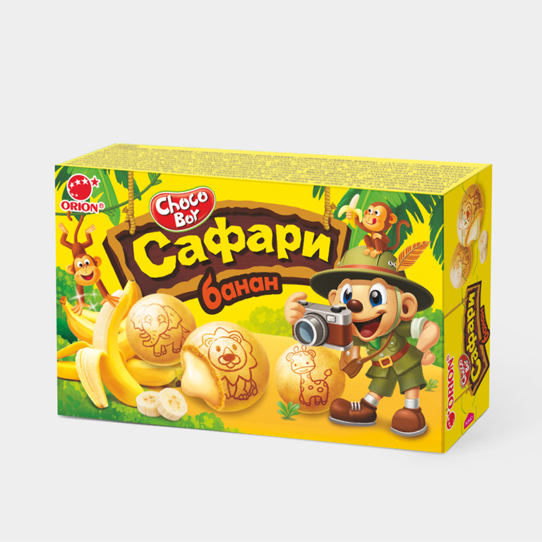 Choco Boy Safari Banana - это печенье в форме шара с нежной молочной начинкой и ароматом сочного банана.