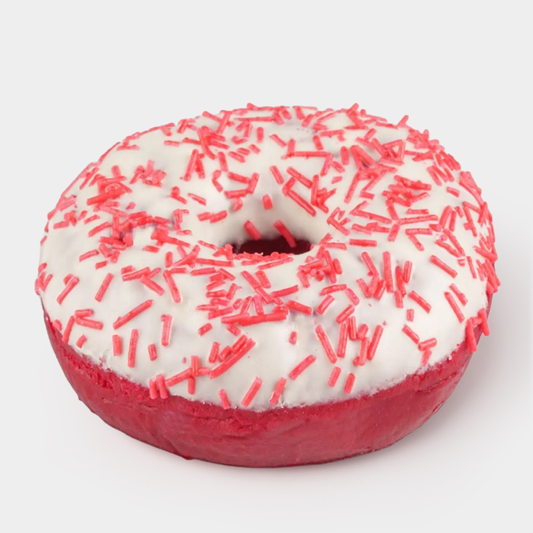 Красный пончик с белой глазурью, с нежным тестом и сливочной начинкой.