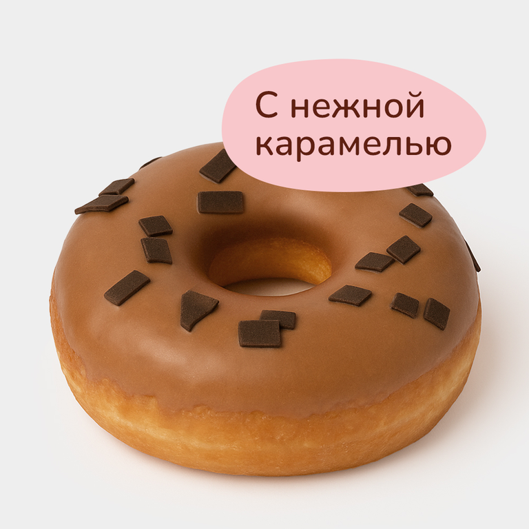 Аппетитный пончик с воздушным мякишем и мягкой карамельной начинкой.