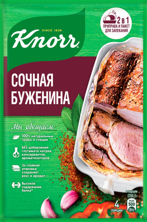 Используйте пакетик для запекания, который находится в пачке Knorr На второе. Благодаря смеси Knorr и запеканию в пакете буженина станет сочной и необычайно ароматной и вкусной!