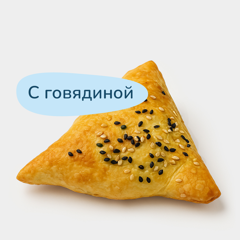 Традиционный пирожок треугольной формы из нежного теста с сочной начинкой из говядины с репчатым луком и перчиком.