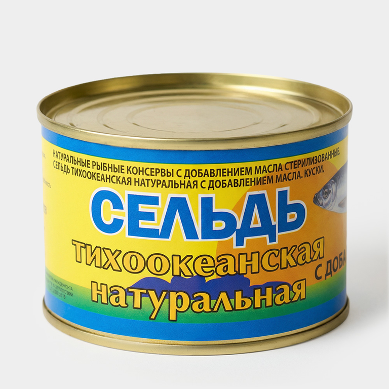 Натуральная консервированная тихоокеанская сельдь с добавлением масла, произведённая по ГОСТу.