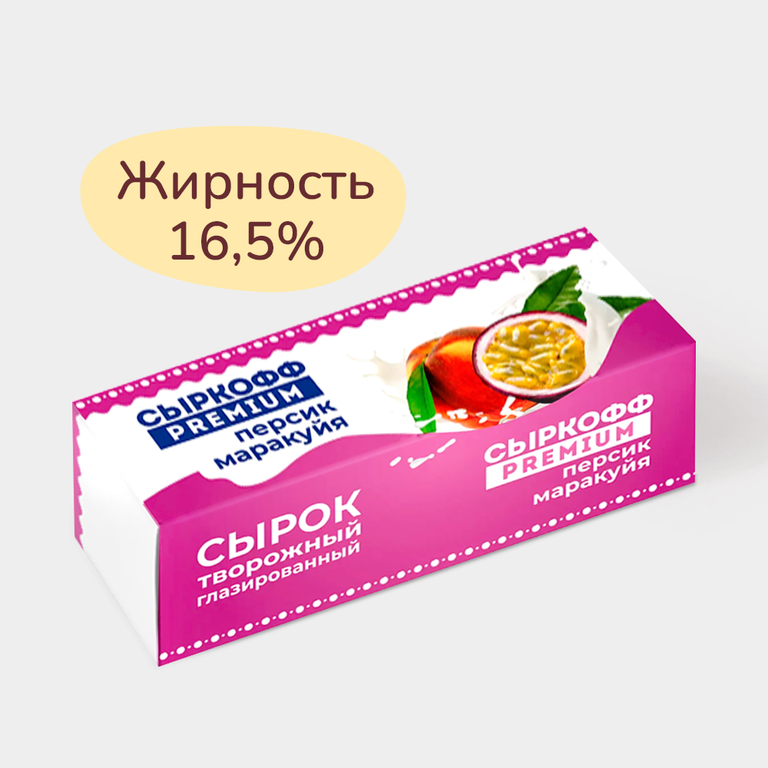 Приготовленный по ГОСТу сырок из натурального творога с начинкой с персиком и соком маракуйи, покрытый шоколадной глазурью.