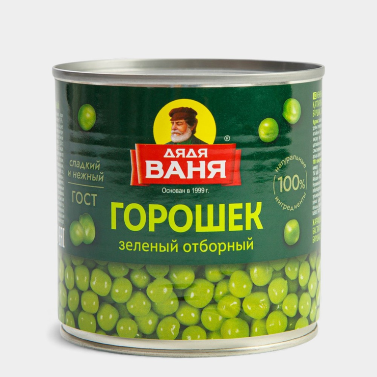 Спелые, вкусные зёрна лучших сортов зелёного горошка, выращенного на полях Краснодарского края, приготовленные по ГОСТу.